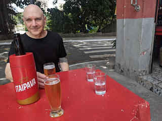 On our way, at about 12:01, we spotted a promising place across the street, Nana's Bar and were delighted to discover that they'd opened at noon. Proceeded to spend a magical couple of hours with another cerveja jelada and a couple of glasses of cachaça.
